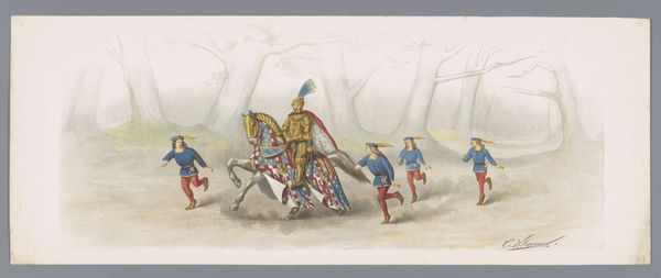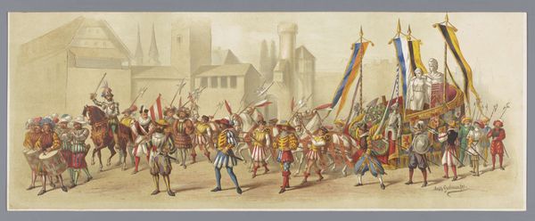 This processional scene, Utrechtse Maskerade van 1876, was painted anonymously, with watercolor over graphite on paper. The soft application of watercolor creates the appearance of a light airy scene. The work’s transparency and fluidity, a result of the watery medium, lend the parade a somewhat dreamlike, ethereal quality, as if it’s fading away from collective memory. The choice of such a delicate medium gives the impression that the piece was made for personal appreciation, not necessarily for public display. The artist’s technique involves building layers of diluted colors to achieve depth and form, which gives the image a gentle, almost nostalgic aura. The graphite underdrawing adds definition to the figures and architectural details, grounding the composition. The artist’s choice of this medium, with its relatively accessible and easily mastered techniques, suggests a deliberate move away from the grand historical painting which was more typically rendered in oil. It underscores the increasing relevance of materials, making, and context in fully understanding the meaning of a work of art.