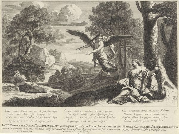 Curator: Look at this etching, "Mutius de kluizenaar," created between 1583 and 1588 by Johann Sadeler I. It’s currently housed here at the Rijksmuseum. Editor: It has an eerie quality, don’t you think? The light and shadow are so intense, and this gaunt figure in the landscape evokes a strong feeling of isolation and even… despair? Curator: Yes, and it embodies Mannerism through its exaggerated figures and theatrical compositions. Observe how the figure, presumably Mutius, occupies the liminal space between the wild woods and the beckoning town, perhaps symbolizing his internal struggle. He is caught between seclusion and his obligations. Editor: It's curious that Sadeler chose etching—the sharp, linear quality emphasizes every wrinkle and vein on Mutius. Look at the twisted trees mirroring the old man's physical struggles. What do we know about the context surrounding this piece? Curator: We find textual information on the plate that reads "Mutius, excelling in virtue, leaves the desert...He often hastened to his brothers to take a step... He soothed the weak and feeble bodies. He consecrated his sacred life, and buried the fatherless." Sadeler was renowned for his skill in depicting allegorical scenes laden with religious and moral teachings, perfectly encapsulated in his landscapes, often portraying hermits as exemplars of steadfast Christian virtue. Editor: Right, but how subversive is he being? Mannerism loved that sense of controlled tension, that feeling of being slightly *off*. Sadeler doesn’t shy away from showing us a really physically diminished man, someone wrestling with leaving behind, possibly, what kept him alive. And there is something very humanizing about it. Curator: Indeed, perhaps the emotional vulnerability displayed here is not just a symptom of its style but also a conscious move to depict the frailty of flesh against the fortitude of the spirit. It's like Sadeler’s acknowledging the immense sacrifice such a solitary life entails. Editor: Makes you wonder about your own life choices, doesn't it? Pondering the value of solace versus societal life when confronted with art always tickles something deep inside. Curator: Yes. Indeed a poignant contemplation for our audience, urging introspection beyond surface-level appreciation.