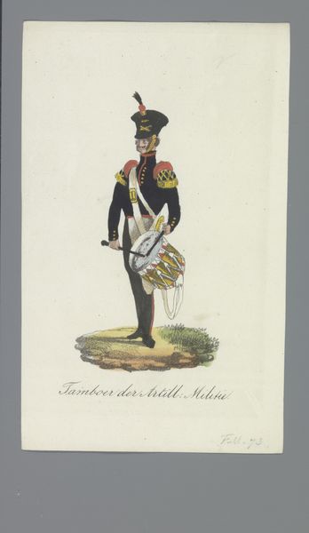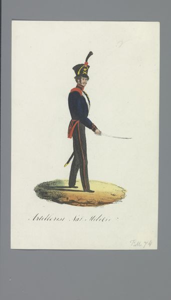 Curator: Oh, there's something so charmingly self-assured about this fellow, isn't there? The crossed arms, the confident stance... Editor: Indeed. We are looking at an artwork titled "Officier Artill: Militie," attributed to Albertus Verhoesen, likely created between 1835 and 1850. It's currently held in the Rijksmuseum. But beyond the dates and titles, what do you read in this man’s portrait? Curator: An air of both playful dandyism and… seriousness. Like a toy soldier contemplating real battle. The artist beautifully captured that ambivalence. The bright trim on his dark blue jacket! It gives a visual kick against what otherwise might seem somber. Makes you want to ask what his day looks like. Editor: And the sword—symbol of power, authority, and… let’s face it, patriarchal structures—prominently displayed at his side. The confident pose can also be interpreted as an assertion of dominance and social control, which the militaristic man held at the time, can it not? Who were the marginalized during the Romantic era and how might they have interpreted this image? Curator: It’s the Romantic era in a nutshell, isn't it? Ideals, grand passions, a certain wistfulness... a kind of theatre and pageantry. And while the artwork presents this officer in what looks to be, to me, a proud stance, Verhoesen doesn't shy away from including the vulnerability implicit in being the subject and enforcer of societal and military expectations. What I notice are the muted colors in his face, or the way the horizon cuts him off, offering no path, suggesting perhaps a man stuck between performance and duty. Editor: Yes, and perhaps the reality of being a soldier. The romanticized image of warfare versus its actual brutal consequences is always a tension within military portraits of this era. These objects are, historically, loaded and require interrogation on multiple fronts. The visual culture perpetuates, reinforces, and celebrates this patriarchal society and its ideals. Curator: You're so right. It's the push and pull, isn’t it? He’s a figure caught between worlds: an almost melancholy soldier with gorgeous pops of golden yellows. The artist manages to complicate an otherwise conventional trope of the era—militaristic bravado. I love art for this very reason! Editor: Precisely! The complexities, the tensions... Thank you, that's all from us for today.