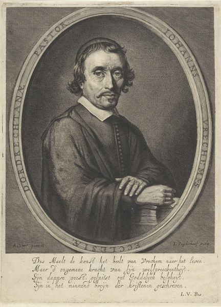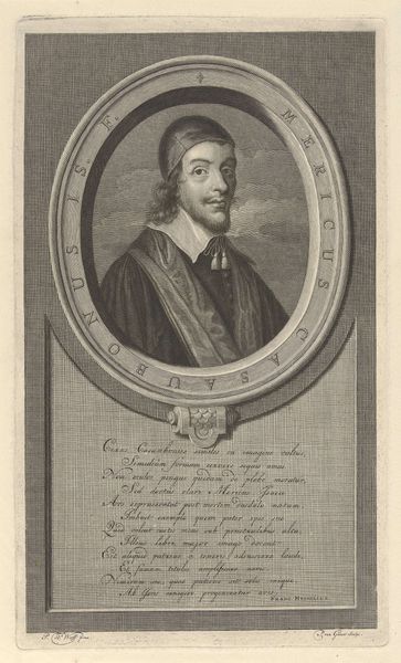 Editor: Here we have Jean Morin’s portrait print of Pierre Bartier, Bishop of Montauban, created sometime between 1605 and 1650. The precision in the engraved lines is really striking, almost photorealistic, yet the subject seems rather... reserved, I think. How might we unpack the presentation of power at play here? Curator: That "reserved" quality is interesting. It isn’t quite the bombastic, assertive grandeur we might expect from a Baroque-era cleric, is it? Think about the function of portraiture at this time, though. Who would commission a portrait of a bishop, and how would they want him represented? Editor: I imagine the church, perhaps, to project authority. Curator: Precisely! This print, however, has a dual role, both disseminating his image broadly and solidifying his position within the Catholic Church. His garments, though seemingly simple, telegraph immense power, rooted in complex political realities. And notice how the architectural setting further elevates the sitter. Editor: It's fascinating how something seemingly straightforward carries so much coded information. Are there any clues that explain it beyond face value? Curator: Consider the context: the Counter-Reformation, the increasing power of the French monarchy. Every detail here—his gaze, the rendering of his robes, the architectural framing—is calibrated to convey authority and piety at a time of great religious and political upheaval. How do you see the visual style supporting these aims? Editor: The very tight line work feels very proper and maybe suggests stability, almost as a form of visual propaganda. It does lead you to consider the politics of imagery! Curator: Precisely! We can see here how printmaking becomes a crucial tool not just for artmaking, but for consolidating ideological power. It highlights how art participates in broader systems of belief. Editor: Thanks, that perspective helps to uncover meaning. I will rethink my assumptions about Baroque portraiture in the future. Curator: Excellent! Looking at art this way encourages us to interrogate what institutions want us to see and, perhaps more importantly, what they’d prefer we didn't.