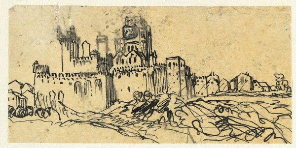 Editor: This is Rodolphe Bresdin’s "Ville en Bretagne," a small ink drawing from the Harvard Art Museums. It feels like a fleeting memory, with those quick, almost frantic lines capturing the essence of a town. What do you see in this piece? Curator: I see a dialogue between structure and freedom. The architecture, rendered with such precision, hints at a community’s history and shared identity. Yet, those swirling lines above… Do you see how they unsettle the otherwise orderly scene? They almost seem like whispers or unresolved thoughts hanging over the town. Editor: That's interesting! So, the town represents stability, and the lines, maybe, an undercurrent of something else? Curator: Precisely. Bresdin was deeply interested in the interplay between conscious and unconscious realms, the visible and the invisible. Think about how those elements might reflect the cultural anxieties of his time. Editor: I never thought of it that way. I see the drawing differently now!