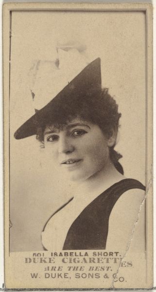 Curator: Oh, she seems lovely. A delicate and quiet strength radiates from this portrait. Editor: And diminutive. It's a trading card, of course, from a series published by Wm. S. Kimball & Co. in 1889. "Daisy Murdock, from the Actresses series (N203)." Curator: Trading cards... How far we’ve fallen! Now it’s pop stars. Imagine collecting actress trading cards! Editor: Well, it's more than just collecting images of pretty actresses, right? Think about the cigarette production. The card serves a structural purpose, keeping the cigarettes from being crushed in the packet, but more importantly, it’s advertising—and cheap. Curator: Yes, but I still think that such a delicate, painterly representation of Daisy has more layers to it. It is almost ethereal in the way the light touches her cheek. It hints at a fragile, ephemeral beauty… perhaps like smoke? Editor: Possibly, although those photographic chemicals are not famous for being ecologically sensible either, are they? Plus the mass printing itself. Think of the paper mills. Curator: Well, that does ground my head in harsh reality. I see a young woman on the cusp of fame or, perhaps, swallowed up by the theater, just as the earth itself may swallow us all. It makes one philosophical, this dainty little image. What dreams did she have? Editor: Did she even consent to be on this card, or did the studio have those rights? What was the financial agreement? What rights did these women have, appearing on this proto-capitalist paraphernalia? Curator: Right, let’s not become too lost in my musings about fading beauty when questions about female empowerment are also written in the history of this photograph. A tiny treasure from another age, revealing as much about them as ourselves, no matter our outlooks. Editor: Absolutely, the act of collecting itself speaks volumes—consumption and aspiration neatly packaged together. Makes one think, doesn't it?