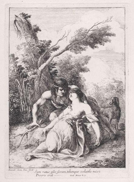 Editor: Here we have "The Flirt," a plate by Louis Crépy. The cross-hatching gives it a dreamlike quality, and the figures are so elegantly posed. What do you see in this piece? Curator: Observe how Crépy uses line and form to create a sense of depth, drawing the eye from the detailed foreground to the softer background. The composition leads the viewer to consider the relationship between the figures and the landscape. Editor: So, it's less about the story and more about how the lines create depth and define the figures? Curator: Precisely. It's through these formal elements that the work achieves its meaning. Notice the contrasting textures of the foliage and the clothing, for instance. Editor: I see! It all comes back to the interplay of lines and textures creating the piece's effect. Curator: Indeed. Analyzing these formal elements unlocks a deeper understanding.