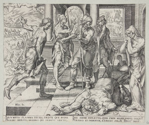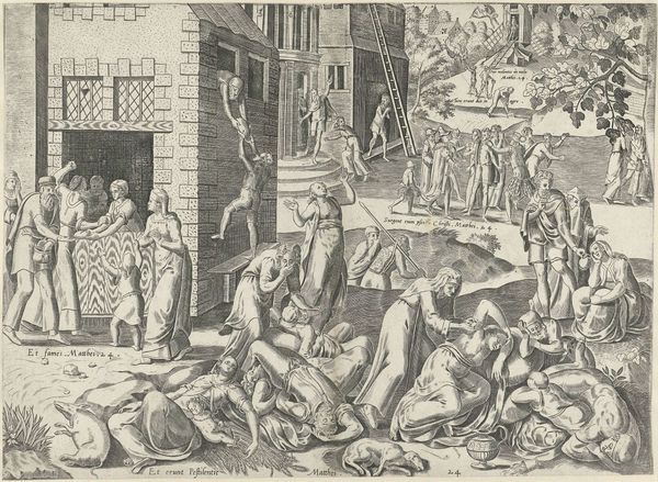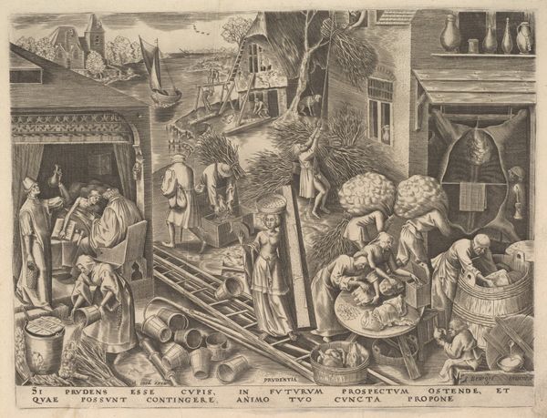 Curator: This engraving, entitled "De dood is de armen welkom," meaning "Death is Welcome to the Poor," was created between 1595 and 1600 by Johann Sadeler I. It is currently held in the Rijksmuseum. What are your initial thoughts? Editor: Stark. The scene's detailed representation of poverty juxtaposed with the figure of Death is very confronting. I'm immediately drawn to the textures – the rough wood, worn fabrics, the sheen on those meager bowls. The labor involved in its creation is evident. Curator: Absolutely. Considering the socio-economic context of the late 16th century, this piece can be interpreted as a social commentary on the disparities between the wealthy and the impoverished. Death, usually feared, is presented almost as a liberator from earthly suffering. Editor: Exactly. Look at the tools scattered around. This is about the raw physicality of survival, the relentless labor demanded of the poor. Death is shown in contrast to these people: exhausted and draped in chains in contrast to them trying to make the most of living. Curator: And there's a stark contrast, too, between the interior squalor and the implied freedom of the outdoor scene seen through the doorway. This invites us to reflect on how deeply social and economic structures influence life, and even death itself. Consider, too, how this image might have been perceived then versus now, given shifts in societal attitudes and beliefs. Editor: The print medium itself adds to this discussion. Engravings made it accessible, democratizing these images of morality and critique. The ability to reproduce this and circulate such commentary is deeply ingrained in the social power of the medium itself. Curator: The figuration, so typical of the Northern Renaissance, also emphasizes genre painting and history. These styles are brought together to show the experience of the poor is part of everyday and historic narratives. It makes us wonder, what other historic struggles are omitted from history due to their socio-economic insignificance. Editor: For me, it underscores that art doesn't exist in a vacuum; it's embedded in the material conditions of its creation and reception. Analyzing those elements gets to the heart of its power. Curator: I think that's it. This image really illuminates the many layered historical contexts of art! Editor: I agree completely. Let's move onto the next work now!