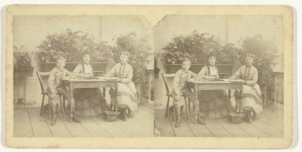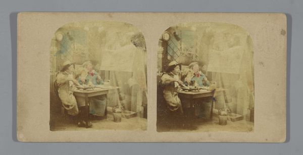 Curator: This curious piece, dating from around 1857 to 1859, is titled "Man schrikt van een spook"—or, "Man startled by a ghost." It’s an anonymous daguerreotype, enhanced with color. Editor: My first impression is just how tactile it feels despite being a photograph. The subdued color palette and aged paper give it an eerie yet familiar mood—it's not a terrifying scare, more like a parlor trick. Curator: Indeed. As a daguerreotype, its creation was a complex, painstaking process involving polishing a silver-plated copper sheet and treating it with fumes to make it light-sensitive. Coloring the image further required skilled application, likely by hand, highlighting the labor embedded within early photographic practices. Editor: Right. Thinking about its social context, though, I'm struck by the ghost as a symbol of Victorian anxieties—loss, mortality, the blurring lines between science and spiritualism. Photography itself was seen by some as a means of capturing the unseen, the spirits of the dead. It plays into societal fears surrounding mortality during an era plagued by disease, grief, and spiritualism. Curator: Exactly, that interplay between scientific innovation and widespread spiritual fascination is critical here. The image operates almost as a staged tableaux, revealing how the material production of spectral imagery was carefully crafted through photographic processes. This invites us to think critically about the photograph's capacity to both record and invent, to both mirror and manipulate perceptions of reality. Editor: Considering how photography emerged, in the broader context of a rapidly industrializing society where traditional spiritual and social structures were collapsing—this "ghost" also could represent collective disruptions. Perhaps we should consider if this staged setting represents a particular type of fear—one born from change. Curator: Interesting thought! It adds layers to the understanding, situating it firmly in its socio-historical context, linking the individual 'startled man' to much broader cultural changes. This reveals a profound reflection on shifting societal values. Editor: So, instead of merely dismissing the photograph, a deeper viewing reveals complex layers about mortality, loss, technology, and cultural norms of the mid-19th century. It opens up questions, like the ongoing need for reassurance during rapid transformation. Curator: Absolutely. The materiality combined with these anxieties provides insight into historical visual culture and its interaction with belief. Editor: Yes, it provokes contemplation of how technology and spiritual unease have intertwined throughout history—something quite relevant even today.