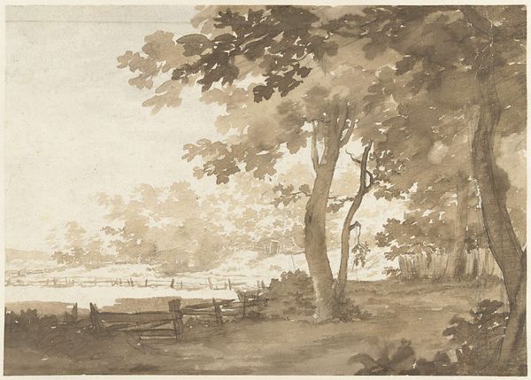 Hendrik van der Burgh created this drawing titled "Landschap met een pad waarop mensen lopen" using pen and brown ink with brush in the late 18th or early 19th century. It depicts figures on a path leading into a wide, flat landscape. The sketch gives us a glimpse into the world of the Dutch Golden Age and its legacy as a social structure. The Netherlands was a major maritime power. This is likely the social environment and culture that shaped the artistic production of van der Burgh. The figures in the image are dwarfed by the landscape, perhaps reflecting the social values of the time, such as individualism and humanism, as well as the appreciation of nature. To fully understand the meaning of this landscape, we need to explore the visual culture of the Dutch Golden Age, as well as the institutions that supported the production and reception of art. Only then can we appreciate the social context and artistic intention behind this simple, yet evocative drawing.