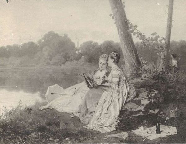 Curator: This is Henry Peach Robinson’s photographic print, “A Merry Tale.” Editor: The tonality immediately strikes me—a sepia dreaminess. The composition, though, feels staged. Curator: Robinson was known for his combination printing technique, layering negatives to create idealized scenes. The women here evoke romantic notions of rural life, echoing pre-industrial folk tales. Editor: Agreed. Note how the subjects are arranged—a deliberate tableau. The contrast between light and shadow sculpts the figures, almost as if they are performing for us. Curator: The image whispers of shared stories, of camaraderie among women in a bygone era. It draws on deeply ingrained cultural symbols of the countryside, and speaks to a longing for simpler times. Editor: It's undeniable how skillfully Robinson manipulates the visual elements to construct this narrative. Ultimately, this image, with its constructed reality, offers a glimpse into the romantic sensibilities of the 19th century.
