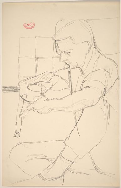 Curator: Here we have a pen and ink drawing by Mark Rothko, titled "Woman Seated with Pad in Lap and Holding Paper in Each Hand." It is undated. What are your initial thoughts? Editor: It has an almost melancholic quality. The woman’s posture, head bowed, and the starkness of the ink create a feeling of quiet introspection. There's also a certain ambiguity due to the thin outlines. Curator: The reductive use of line is fascinating, especially when we think about drawing's place within art production. Rothko, celebrated for color field painting, reveals here a reliance on direct hand-to-paper skills, the act of rapidly committing thought to the material support. There is minimal intervention. The cheapness and disposability are quite frank, isn't it? Editor: Absolutely. And thinking about her position, seated with paper in both hands, she’s surrounded, almost imprisoned, by potential. But the downcast gaze, does this imply she feels overwhelmed or perhaps reflective? The paper itself could symbolize memory, knowledge, or perhaps even suppressed emotions she’s grappling with. Curator: Note the starkness of this depiction as it intersects with the market-driven impulse towards recognizability of the body. This sketch prioritizes economy of line in what one might recognize as the visual trope of melancholy, particularly where gendered experience is involved. There's an argument to be made, isn't there, that this very efficiency served the needs of speedier commodity exchange? Editor: I see your point. However, the pose reminds me of images of scribes or thinkers, perhaps suggesting inner searching rather than external engagement. Her posture could be read as embodying contemplation, almost like a modern-day muse absorbed in thought. It resists easy categorization, wouldn't you agree? Curator: Resist perhaps in intent, yet the cultural codings are hard to shake. The means are cheap, yes, and one can interpret an air of the unique out of it, yet the economic realities always tug at our assessment. Editor: Even with that in mind, I'm struck by how the simple medium conveys such depth of feeling and evokes connections to a wider cultural narrative of creative or intellectual figures in repose. It transcends its materials. Curator: An interesting dialogue indeed, tracing a simple portrait that complicates assumptions about making, consumption and recognition. Editor: Yes, an image of quiet labor with resonance across time.