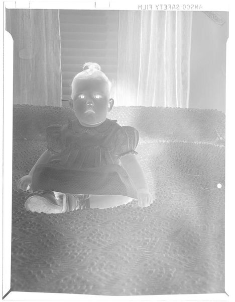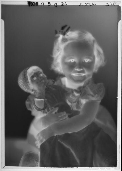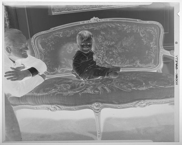Editor: This photograph, Untitled (baby on couch with woman) by Lucian and Mary Brown, shows a woman and child on a patterned sofa. It feels very intimate and domestic. What narratives do you see at play here? Curator: The seemingly simple scene opens a space to consider the power dynamics inherent in the domestic sphere, the roles of women and children, and how these are shaped by social expectations and gendered labor. What does the child's gaze suggest to you? Editor: It feels confident, almost challenging. It makes me rethink my initial assumptions about power. Curator: Exactly! The photograph destabilizes traditional interpretations, inviting a dialogue about agency within the constraints of domesticity. The photograph becomes a site of resistance. Editor: I hadn't considered that before. It really changes how I see the image. Curator: Indeed. Recognizing the photograph's social context allows for deeper inquiry into seemingly simple scenes.