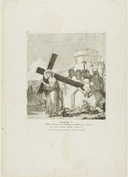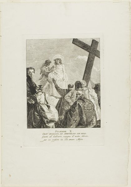 Editor: This is Giovanni Domenico Tiepolo’s "Christ Consoles the Weeping Women," a print from around 1748-1749. It’s an etching on paper, and the scene feels incredibly intimate, despite the large crowd. What symbolic weight does Tiepolo seem to be drawing upon here? Curator: Indeed, the emotional gravity is palpable. Notice how Tiepolo utilizes the symbolic weight of the cross itself. It dominates the composition, but Christ's interaction with the women creates a softer focal point. It speaks to an enduring connection between suffering and compassion. Do you observe any specific iconographic elements that reinforce this interpretation? Editor: The women's gestures, perhaps? They're very expressive, drawing our attention. Also the text beneath the artwork! Is it a direct quote? Curator: Precisely! The women's gestures of sorrow underscore centuries of inherited visual language denoting grief, while Christ's counter gesture is less prominent but vital for what is reveals. The added text from the artwork amplifies it all. How does the knowledge of this reference alter your understanding? Editor: It deepens it, creating layers. There's the immediate visual impact and then the recognition of a larger story. I am wondering though why they all seem very stylized. Is there a deliberate aesthetic choice going on there? Curator: That stylization, I think, strengthens that dialogue with art historical symbols and tropes of piety. Tiepolo engages our own memories with the historical understanding that symbols evoke cultural context. In this piece we become active participants by recalling images of mercy that precede this piece. In fact, each figure appears consciously placed for its symbolism. Editor: I hadn't considered the interplay between personal interpretation and collective visual memory. I guess decoding these works can turn anyone into an amateur symbologist. Curator: Precisely! It is a beautiful example of the emotional and intellectual layering art invites. The simple gestures of human emotion become an echo throughout history, remembered in pictures.