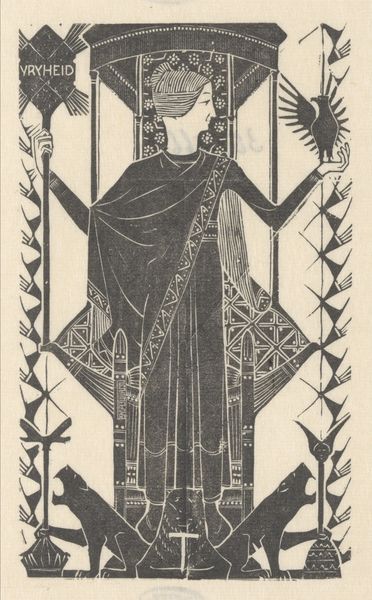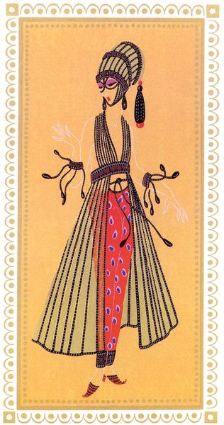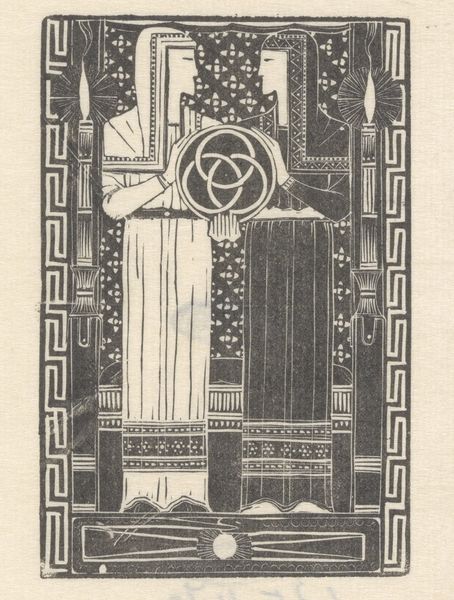 Editor: This drawing, titled "Venere in Pelliccia" by Erté, uses really interesting decorative art elements. It looks like an illustration, almost a stage or fashion design. It is striking with the elongated figure of a woman and bold geometric borders against a solid black background. How can we understand the artistic statement and social context of a work like this? Curator: Well, considering Erté's career, that immediate read of 'stage design' is key. He heavily influenced theatre and fashion, and more broadly popularized Art Deco aesthetics. Look at how the stylized figure of Venus embodies those 'exotic' images which captivated the early 20th century. Doesn't it almost remind you of figures from a Ziegfeld Follies poster, or a more ornate flapper illustration? Editor: Absolutely, that theatrical connection makes sense. And the costume…I almost feel as if that could have sociopolitical intent to challenge conventional artistic figures. But where does it stand in the timeline? Curator: The early 20th Century was an environment that enabled Erté's creativity to really impact not just what elites collected as fine art, but the mass-produced and distributed images. Understanding that reciprocal relationship informs any meaningful analysis of how his Venus, a goddess, is seen or presented to a broader public. Editor: That's a very valuable connection; to explore Erté's influence on society in relation to his depiction of women... the artwork in public places shaping perceptions, not simply mirroring them. Curator: Precisely. It highlights the critical role decorative and applied arts can play in influencing mainstream visual culture, not just passively reflecting pre-existing social norms, thereby democratising art. Editor: Thank you! That has definitely changed my initial impression and will direct my studies in many ways. Curator: My pleasure. These decorative figures can act as a vital snapshot into society at that time.