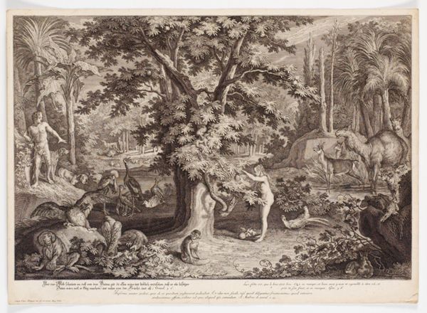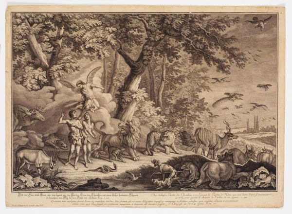 Editor: This is "Gud opdager at Adam og Eva har spist af kundskabens træ," an 18th-century engraving by Johann Elias Ridinger, depicting God discovering Adam and Eve after they ate the forbidden fruit. There is something striking in how theatrical and detailed the composition is. What does this narrative scene tell us about its historical context? Curator: It’s fascinating how Ridinger stages this scene. It’s not just a biblical moment but a societal one. The dramatic landscape and inclusion of diverse animals speaks to a specific 18th-century worldview. What role do you think the concept of 'the Fall' played in the cultural understanding of authority and social order at the time? Editor: It's almost like the animals act as silent witnesses or symbols of a lost harmony. Could this image also comment on emerging scientific views and humankind’s place in the natural world? Curator: Precisely. Remember, this engraving circulated widely, shaping public perceptions. Think about the power dynamics it subtly reinforces: God’s judgment, Adam’s submission, and perhaps, through Eve's figure, a caution against female autonomy. This imagery was instrumental in justifying social hierarchies and moral codes. How does that compare to contemporary representations of these ideas? Editor: That's a compelling point. I initially saw the drama but missed the social commentary. Understanding the historical function changes everything. Curator: Exactly. Seeing art as a social product helps us understand how it functions beyond aesthetics. Every element, from the animals to the theatrical poses, serves a purpose within that context. Editor: So, it's less about individual expression and more about reflecting and shaping a collective understanding of morality. Thanks! I see this engraving in a new light now. Curator: And that is precisely how we extract valuable understanding from studying art's interaction with its cultural time.