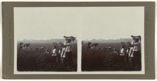 Curator: This gelatin silver print, attributed to J.H. Hasewinkel and titled "Jeugdstorm helpt met hooien," translates to "Youth Storm Helps with Haying" and it is believed to have been taken sometime between 1943 and 1948. Editor: At first glance, it strikes me as strangely idyllic, even nostalgic. A horse-drawn hay wagon piled high with golden straw, topped by children, against a summer sky... yet the "Youth Storm" title hints at something more complex. Curator: Indeed. The "Jeugdstorm" was a Dutch youth movement modeled after the Hitler Youth. Seeing them presented in what appears to be a celebration of rural labor is... unsettling. It's easy to romanticize such scenes, but this photograph has clear political implications related to forced labor. Editor: Yes, those symbols… the hay itself, almost obscuring everything, feels like a weight – both literal and figurative. The act of harvesting connects us to deep agricultural roots and simpler times, but here, the meaning is twisted, burdened. The figures on the wagon, are they joyous, or are they just performing their assigned roles? Curator: The image is compelling propaganda, certainly, meant to depict this group contributing to the national good during a difficult time. The deliberate construction of a cohesive national identity is hard to ignore, especially during a period defined by scarcity, occupation, and political unrest. It romanticizes collaboration. Editor: The black and white tones amplify the severity of the historical context, don't they? A colour image might try to sweeten this, but the monochrome strips away any softening and forces us to deal directly with the reality. This seemingly bucolic image holds so much cultural anxiety, and that hay takes on a sinister appearance the longer one looks at it. Curator: Ultimately, Hasewinkel’s photograph prompts us to confront uncomfortable questions about the manipulation of imagery and the blurring of lines between idealized rural life and politically charged symbolism. It compels us to re-examine the power of photography and question its supposed objectivity, especially during times of conflict. Editor: Yes, seeing how symbols of innocence and tradition could be exploited leaves a disquieting effect. It serves as a reminder to consider the narratives behind all images and of who controls those narratives and how they will be seen.