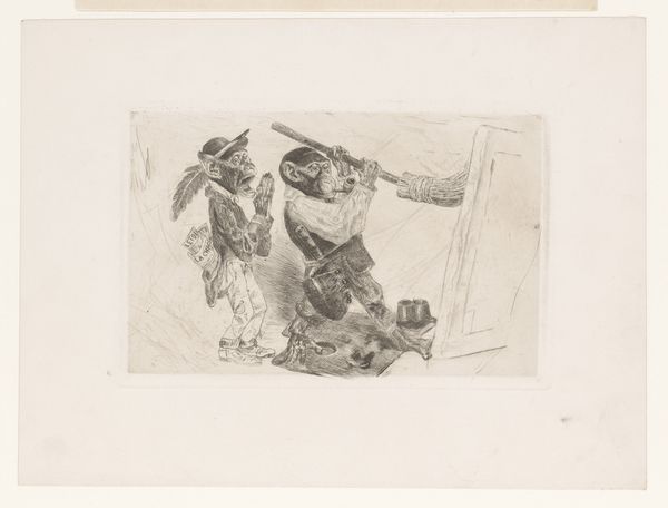Curator: Here we have "Mannen vervoeren een gewonde," or "Men Transporting a Wounded Man," an engraving dating to 1873. The piece is currently held at the Rijksmuseum and is credited to jonkheer Victor Eugène Louis de Stuers. Editor: It has a somber feel, doesn't it? Very spare composition in monochrome, figures etched with clear, precise lines, conveying an overall sense of solemn purpose. There’s an almost photographic quality to it in the details. Curator: Yes, precisely. Note the cultural context in which it was created. The late 19th century in the Dutch East Indies, the Dutch Colonialism and it's projection as benevolence. What purpose do you think an image like this might serve in that era? Editor: The injured man carried in a makeshift litter immediately evokes a sense of burden, literally and perhaps metaphorically. Given the period, there is perhaps a symbolic display of imperial responsibility... or is there? The symbolism of collective struggle seems equally as potent, depending on the beholder. Curator: It becomes a question of audience, and what they project onto the imagery. Note how those bearing the stretcher and equipment carry firearms: we understand that what we are witnessing stems from conditions of conflict. Editor: The head coverings are also so significant. They indicate not just cultural background, but likely some environmental need - shelter from the sun, and potentially marking identity or even status through design details. Curator: Consider how visual symbols shape the public understanding of conflict, then and now. Is the image designed to provoke sympathy, justify actions, or simply document? The cultural politics of such a stark representation are hard to ignore. Editor: Indeed, its starkness leaves us with many questions—questions about representation, responsibility, and the endurance of these visuals through time. Curator: A compelling reminder of the power and complexity inherent within a seemingly straightforward depiction of history.