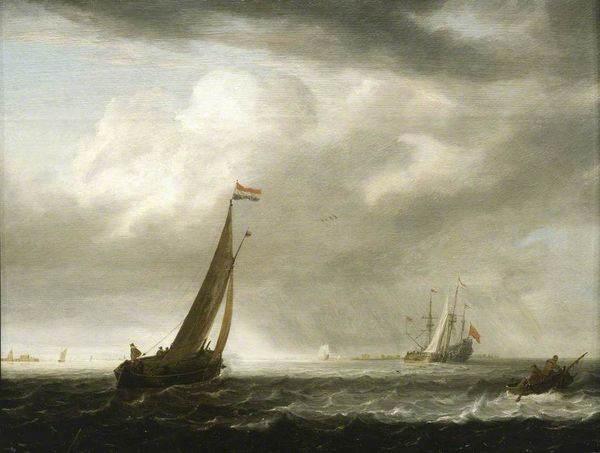 Marcus Larson painted this vivid seascape with oil on canvas. The scene is dominated by the archetypal symbol of a ship at sea, sailing against a dark, clouded sky and the pale glow of the moon. Ships, from antiquity to now, have carried a rich cargo of meanings. Consider the ancient Egyptian barques ferrying the souls of pharaohs across the celestial Nile, or the ships of exploration bringing new knowledge—and conflict—to uncharted lands. Here, the vessel seems caught in a tumultuous journey, not unlike the soul navigating the trials of life, a theme echoing throughout art history. The moon above, veiled yet luminous, has long symbolized the cyclical nature of life, death, and rebirth, reflecting humanity's profound connection to the cosmos. In viewing this seascape, we are drawn into a timeless drama, where the subconscious mind recognizes the enduring power of symbols and the ever-present dance between light and shadow.