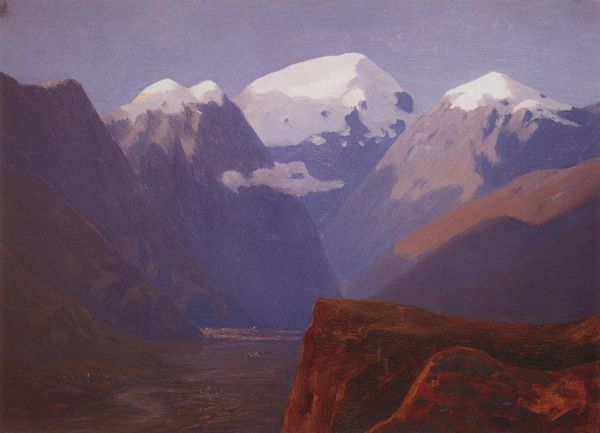 Editor: This is Rockwell Kent’s "North Greenland Fiord, Gray Day," painted in 1933. It's an oil painting, and it evokes such a feeling of vastness and isolation. What do you see in this piece? Curator: I see a statement on man's relationship with the natural world during the interwar period. Consider the social context. Kent, while known for his Romanticism, also engaged with socialist ideals. How do you think that informs his portrayal of Greenland? Editor: I hadn't considered that angle. Maybe the emptiness emphasizes the individual's small role in a huge, indifferent world? Curator: Precisely! And think about the landscape tradition. Earlier, Romantic painters like Caspar David Friedrich often placed a figure within the landscape, dwarfed but still present. Kent largely omits that. What effect does this absence have on the viewer, particularly in the 1930s, a time of global uncertainty? Editor: It amplifies the sense of loneliness. It's not just nature's power, but the lack of human connection within it. Was Kent trying to express something about societal anxieties? Curator: It's plausible. The idealized, untouched landscape can also be seen as a critique of industrialization, a yearning for a simpler, more authentic existence, which aligns with certain socialist utopian visions that became popular during this era. Consider the Hermitage Museum displaying this piece as well. Museums have always been places where values and ideologies are solidified; displaying Kent's painting at the Hermitage suggests a particular ideological commitment. What does this tell us about the function of this museum? Editor: That’s fascinating! It casts a completely different light on what I initially saw as just a pretty landscape. I never considered how Kent’s political beliefs, and the museum’s choice to exhibit it, affect its meaning. Curator: Exactly. The politics of imagery are never absent. Every choice, from the artist's brushstroke to the museum's acquisition, contributes to the dialogue. Editor: I’ll definitely be thinking about context a lot more when I look at art now. Thanks for sharing this insightful perspective. Curator: My pleasure. Examining the context allows us to find many additional perspectives.