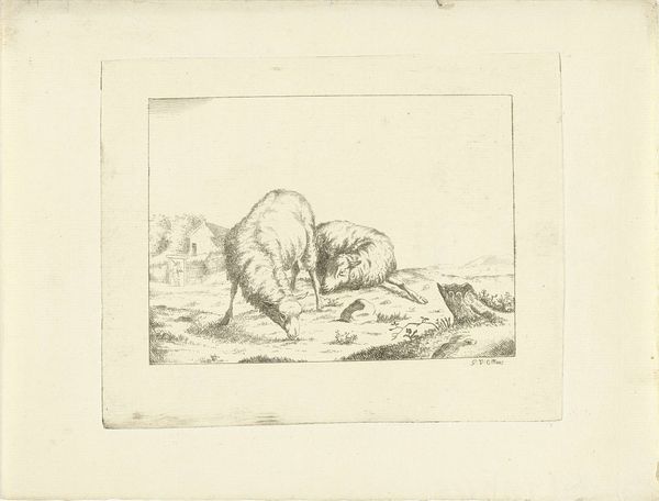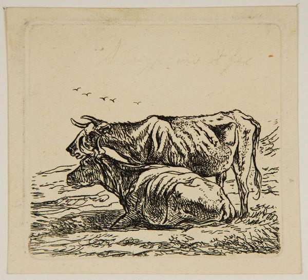 Editor: This is "Twee koeien," or "Two Cows," by Ernst Willem Jan Bagelaar, created in 1814. It's a small ink and pencil drawing on paper. I find the cows almost awkwardly endearing, and the landscape is so minimal. How do you read this piece? Curator: I see more than just cows. Notice how the artist uses line to depict weight, both literal and symbolic. Cows, throughout history, have often represented nourishment and fertility. The artist is referencing not just agrarian life, but something deeper, something essentially life-giving. Do you see how one cow stands while the other rests? Editor: Yes, the standing cow seems alert, while the other is almost...collapsed? Curator: Precisely. Think about what that juxtaposition evokes. Standing could represent provision, guarding; lying down, perhaps surrender, vulnerability. Are we looking at a comment on societal roles, dependence, or even the burdens carried within a family unit? And what of the minimal background; does it isolate them, or simply universalize the scene? Editor: It could be both, right? The sparseness definitely makes them stand out. Maybe it reflects the hardships of the time? It’s so different from idealized pastoral scenes. Curator: That's a very astute observation. By stripping away excess, Bagelaar directs our gaze to the raw, essential relationship between these animals and, by extension, perhaps the viewers and their connection to the natural world and each other. The image becomes an open-ended emblem, rich in interpretation. Editor: I hadn’t considered it that way. Now I see the symbolism everywhere. Thank you. Curator: And thank you for drawing out those insightful connections. It enriches our understanding immensely.