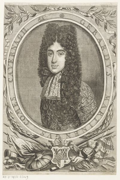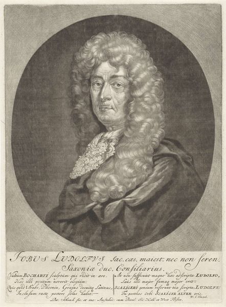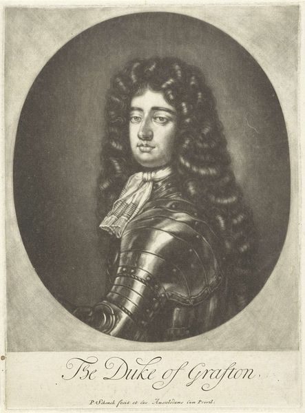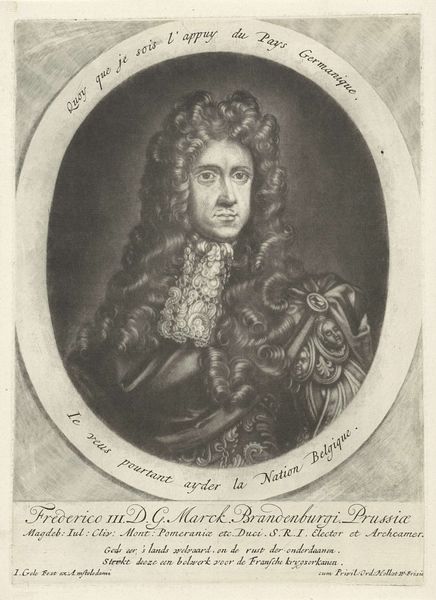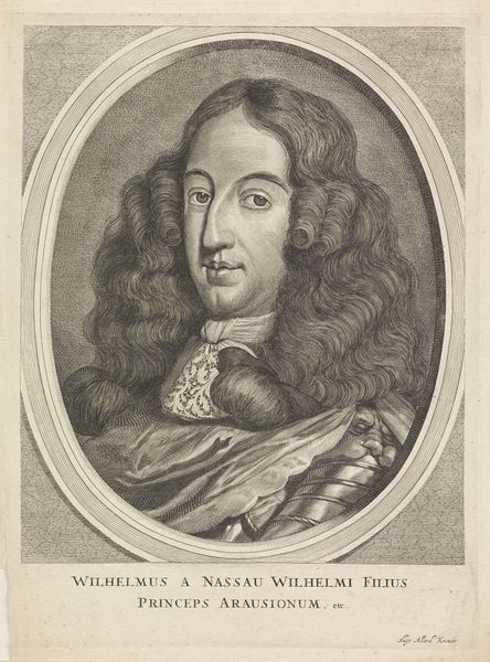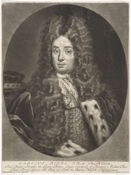Curator: Well, this portrait has an air of authority and maybe even a little arrogance about it. Editor: Perhaps, but to me, it conveys more about the performativity of power than any inherent quality. This is "Portret van Jacobus II, koning van Engeland", or "Portrait of James II, King of England" made between 1670 and 1713, now at the Rijksmuseum. The artist is Pieter Schenk, who created this print using engraving techniques. Curator: Ah, engraving! Looking closely, the lines creating texture in the wig, the lace... It’s meticulous, painstaking. One can imagine the hours of labor involved. I mean, what does it even mean to reproduce the symbols of royal power? Editor: Exactly. This image was made and circulated at a crucial period in British history when anxieties over succession were particularly high. Look at how James II is presented, draped in finery, every strand of his wig in place, meticulously rendered with that engraving you mentioned. All signifiers of legitimacy, particularly as his Catholicism sparked so much conflict and ultimately, his removal from the throne. Curator: So, in effect, this relatively reproducible format – prints – becomes another medium to propagate that brand. Think about the economics involved. It allowed wider distribution. Editor: Precisely, and this particular portrayal has to be interrogated given James II’s controversial and polarizing reign. The print normalizes his reign, and also perpetuates harmful power structures tied to colonialism. Even details that seem stylistic contribute – for instance, that classical oval evokes ideas of continuity, tradition. The lace represents access to raw materials from overseas… nothing about this is neutral. Curator: So, a lot of messaging baked into what looks at first like simply... a fancy man in a fancy wig. Considering how widespread prints like this became, you wonder how that shaped public sentiment? Did the medium change the message? Did its material accessibility democratize royal image? Editor: Those are pertinent questions. Perhaps seeing this now helps us examine our assumptions regarding imagery from earlier historical moments, and who these representations are designed to benefit. Curator: Definitely gives new layers to what I initially perceived as "arrogance." It’s really a master class in controlled messaging.