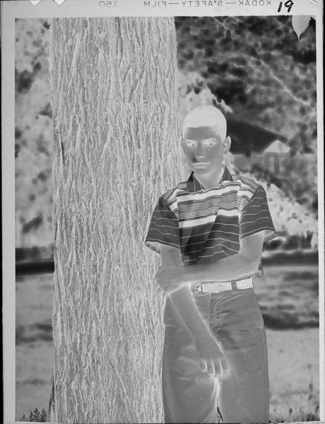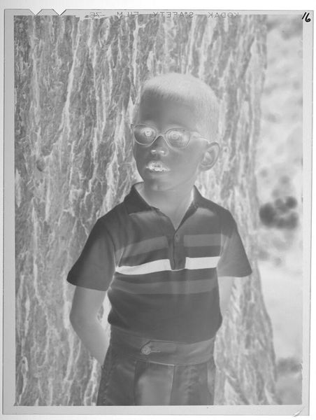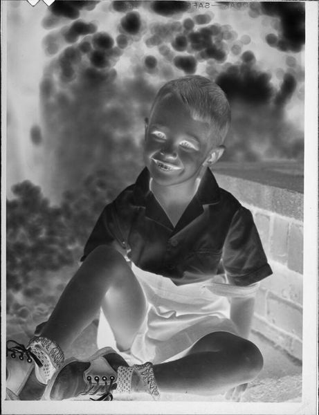 Editor: This is an untitled photograph by Lucian and Mary Brown, showing a boy on some steps. It's striking how the tonal inversion creates a sense of unease. What compositional elements stand out to you? Curator: The reversed tonality immediately draws our attention to the interplay of light and shadow. Note how the geometric rigidity of the staircase contrasts with the organic forms in the background, creating a visual tension. Editor: That's fascinating. I hadn't considered the contrast in forms. Curator: Further, observe the boy's placement within the frame. The positioning, slightly off-center, disrupts any expectation of symmetry, adding to the photograph's disquieting mood. Editor: Thanks, I see that now. It's less straightforward than I initially thought. Curator: Precisely. The power of art lies not always in representation, but in its manipulation of form.