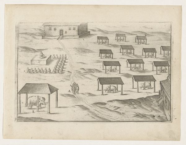 Editor: Here we have “Stallen van de koning van Tuban,” a print from around the early 1600s, author unknown, at the Rijksmuseum. The subject matter feels somewhat stark; it shows what looks like enclosures in a landscape. What do you make of this piece? Curator: It's a fascinating depiction. The "stables," if we can call them that, are rendered with a certain coldness, aren't they? Considering this print would have been circulated during a period of intense European colonialism, it prompts us to think about how the Dutch East India Company and others presented their activities abroad to the public back home. What is ostensibly a simple illustration becomes a political object. Editor: So, you are suggesting that the artist’s choices, like this rather barren composition, might tell a larger story about how this part of the world and its people were being portrayed in Europe at the time? Curator: Exactly. These kinds of prints weren't simply neutral records. They helped to shape public perception of faraway lands and, crucially, justified colonial ventures. Are these stables truly for animals, or could they symbolize something else entirely – perhaps even control and subjugation? Think about the audience that would have viewed this print: how would they interpret these "stables" in the context of overseas trade and expansion? Editor: That is a really interesting angle. I hadn’t thought about how the very act of representing these structures might have served a specific agenda. It definitely reframes the piece for me. Curator: It all reminds us that art rarely exists in a vacuum. Considering its historical context unveils layers of meaning we might otherwise miss. I am also now pondering the extent to which this piece participated in constructing specific attitudes. Editor: Indeed. I'll definitely be more mindful of that in the future. Thanks for sharing your insights!