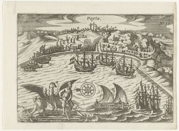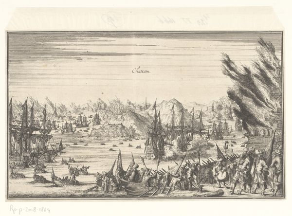 Editor: This print, "Aankomst bij de Ladrones eilanden, 1616," by an anonymous artist and dating from 1617 to 1646, depicts the arrival at the Ladrones Islands. I find the sheer number of ships and figures overwhelming! What structural elements stand out to you? Curator: Indeed. Note how the composition is rigorously organized into distinct planes. The foreground features indigenous figures, likely representing the islanders, while the middle ground is dominated by a dense collection of European ships. A receding coastline provides a sense of depth. The use of line is particularly compelling here; consider the meticulously etched details defining the texture of the sails. Observe also the recurring verticality provided by the masts of the ships. Do you notice any variation in line weight that guides your eye? Editor: Yes, I see that the foreground figures and ships closest to us have much bolder lines, making them visually prominent. Is that a device to emphasize their importance within the narrative? Curator: Precisely. But let us also consider how this strategic variation creates a system of visual hierarchy. The stronger lines assert the primacy of the figures and the nearest vessels. Meanwhile, the gradations of shading – achieved through carefully controlled cross-hatching – modulate a compelling spatial recession. How do the horizon line and the rendering of the sea contribute to the overall impression? Editor: I see how the high horizon line flattens the scene and how the waves, rendered with repetitive, almost stylized lines, add to the feeling of a vast, perhaps even unknowable, ocean. The ships almost appear stacked, enhancing that feeling of density I mentioned. Curator: Yes. What begins as reportage transforms into an experience that verges on the sublime. By paying close attention to its formal qualities, the engraving achieves significance exceeding its mere illustrative function. Editor: I hadn't thought about it that way before. So, beyond simply documenting a historical event, the artist used composition and line to convey a deeper sense of space, scale, and even power dynamics? Curator: Exactly. Appreciating this engraving comes from a rigorous decoding of its form. The careful placement and rendering of elements give a strong organizational system of lines that emphasizes the picture's cultural dimensions. Editor: That is great insight! Thanks so much. Curator: You're most welcome. A deeper appreciation awaits those willing to look closer at such art.