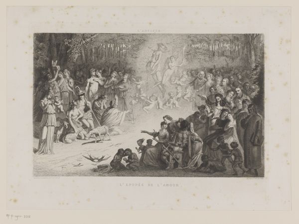 Léopold Flameng made this print, titled "Bacchusfeest," in the 19th century using etching. It depicts a bacchanal, a Roman festival for Bacchus, the god of wine, fertility, and theatre. It is full of mythological references and symbols that were especially popular during the 1800s. The Bacchus festival represented a temporary suspension of social restrictions in the ancient world. In the 19th century, the print medium contributed to the emergence of a mass culture and the commodification of art. The social context of the print as a medium is important. It was easily reproduced and distributed, which made it accessible to a broader audience. Flameng’s print, with its classical and mythological imagery, reflects an interest in the past. Looking at exhibition records and art criticism from the time can help us understand how contemporaries interpreted Flameng's imagery. The print's iconography speaks to the enduring appeal of classical themes and the ongoing negotiation between tradition and modernity in 19th-century French art.