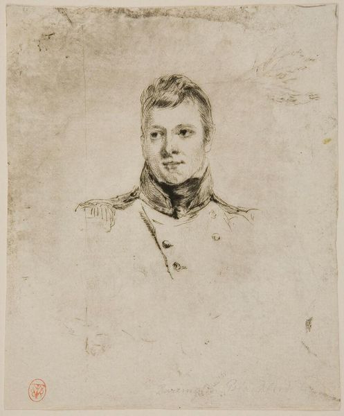 This is Christian Heinrich Gottlieb Steuerwald's portrait of an unknown military figure. Rendered through lithography, a printmaking technique using a stone or metal plate, the artwork employs a structured composition. The lithographic technique enables Steuerwald to craft a spectrum of tonal values, creating an interplay of light and shadow which defines the contours of the officer's face and uniform. The regular rows of buttons on his jacket, together with his high collar, bring a sense of formality and order. Yet, Steuerwald has introduced an asymmetry that hints at a more complex narrative. The figure is slightly off-center, drawing our gaze to the right side of the composition. The artist’s formal choices destabilize the conventional reading of military portraiture. The figure’s direct, somber gaze and the subtle asymmetries challenge fixed notions, inviting a broader meditation on identity. In essence, the lithograph becomes a dynamic site for interpretation.