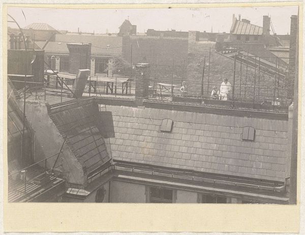 This small photograph, whose maker we know as G. Dangereux, captures a Parisian suburb, likely in the early 20th century. The palette is muted, almost monochrome, which gives it a timeless quality. You know, artmaking is often about this delicate balance between what’s there and what we choose to see. I love how the image is framed by the wrought iron balcony; it creates a sense of distance, as if we are observing this flooded street from a safe remove. Looking closely, the textures are subtle, almost velvety. The rooftops and streets are rendered with such delicate gradations of tone, from the grey slate of the buildings to the dark, reflective surface of the waterlogged street. The carriage traveling down the street is a striking detail. It reminds me a bit of Atget's photographs of Paris, capturing the city not as a grand spectacle, but as a lived-in, breathing space, always changing. Art isn't about fixed meanings, it's more like a conversation, an ongoing exchange of ideas and experiences.