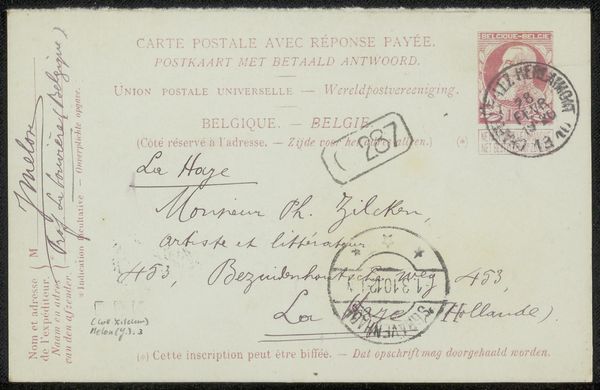 Curator: Octave Maus’s "Briefkaart aan Philip Zilcken," dating from before 1897, presents us with more than just a message—it's a fragment of a conversation frozen in time. It's composed primarily of ink on paper. My immediate reaction is of something ephemeral, a whisper across years. Editor: Ephemeral is right. It feels strangely intimate to be peering at someone's old mail. You can almost smell the dust of history. From a material perspective, this work intrigues me. The postcard itself – mass produced yet then singularized with handwritten ink. What does it say about art’s democratizing tendencies during the 19th century? Curator: Oh, I love that you bring up the mass-produced postcard and the individual mark. It underscores a beautiful tension. This was intended for a very specific reader, Mr. Zilcken. Notice the looping cursive, the care with which the address is written. It transcends the utilitarian nature of a postcard. The cancellation mark is so vibrant and aged, layered in with the purple-tinted printed lettering of the card and handwriting to offer a unified effect that's rather nice! Editor: Exactly! Think about the infrastructures that this small object depends upon—postal systems, ink manufacture, paper production. And who had access? To me, this postcard gestures to class, literacy, the material networks enabling these interactions, these exchanges. Was Zilcken, I wonder, an artist or perhaps a patron of the arts? What relationship did he share with Maus, beyond the transactional postcard itself? Curator: We know Zilcken was a prominent collector, a patron of many Symbolist artists. It places this card squarely in the milieu of artistic exchange. Imagine it being pinned on a wall with other artworks, a casual nod between contemporaries. I get the sense of the early beginnings of a community, being made, piece by piece. I picture artistic connections slowly unfurling across a great distance of land. Editor: A community dependent on accessible transportation, on the ability to disseminate information, of course. Reflecting on that community, how does seeing art in this raw, undigitized state affect your sense of the aesthetic or historic art world in which the postcard was produced and consumed? Curator: I think viewing work from before 1900 provides an interesting counterweight. To see it removed from the hyper-saturation and access to media and data that the 21st century makes us privy to really speaks to the different modes through which social exchange and community may be fostered or generated. It is important to keep that in mind! Thanks for that insightful question. Editor: Of course. The materiality, the hand—it’s all whispering something to us about how these artworks functioned and how they can and will operate in today’s increasingly fast-paced market economies.