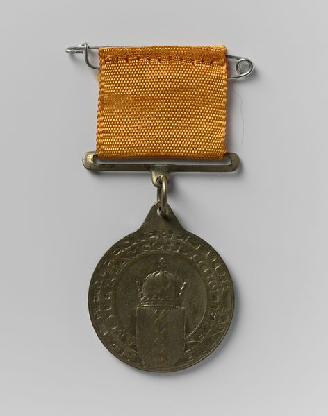 Curator: Here we have a bronze medal, dating back to 1830. It’s a relief print commemorating Louis Joseph de Potter, champion of Belgian independence. What strikes you first about it? Editor: Well, it’s the colours. The tricolour ribbon – black, yellow, red – is instantly recognizable as the Belgian flag. It lends an air of defiant nationalism to what would otherwise just be a portrait medal. Curator: Absolutely. And those colours were deliberate choices. Looking at the materiality, bronze as a medium, lends itself well to the multiple reproductions typical for the popular dissemination of revolutionary ideals. We're talking about accessible art meant for the masses, right when Belgium declared independence. Editor: True, but the use of bronze itself also lends a sense of classical virtue to de Potter. Medals like these draw on a long history of portraiture intended to enshrine values in symbolic ways. Notice how de Potter’s image, though small, projects that sense of gravitas? Curator: Yes, it also speaks to that revival of classical artistic elements—Neoclassicism—that you find threaded throughout art and design of this period. It reinforces this almost instant need for a tangible symbol of Belgian independence. Consider where it was made, for whom, how it was worn, it connects so many different spheres! Editor: And it connects the modern revolutionary figure to historical notions of heroism, I think. Consider, this medal visually places de Potter in the same lineage as the heroes and emperors commemorated in ancient Roman coins, subtly elevating his status. Curator: Good point! What's interesting, also, is how time impacts the medal. The material degrades, the colors on the ribbon fade— it adds another layer of material narrative to the piece, as if to say, these were ideals forged in very particular circumstances. Editor: Definitely. Even now, the Belgian flag triggers all kinds of memories and feelings. It acts as a tiny portal to a significant chapter in Belgian history. Curator: I agree. Thinking about the materials, their original purposes, and their gradual changes certainly makes this work quite special to observe. Editor: Seeing the visual symbols associated with historical identity formation helped to contextualize how that little medal packs a big punch in communicating collective ideals and values.