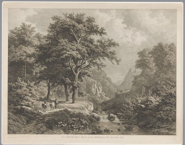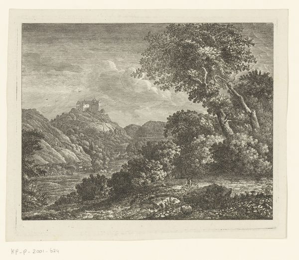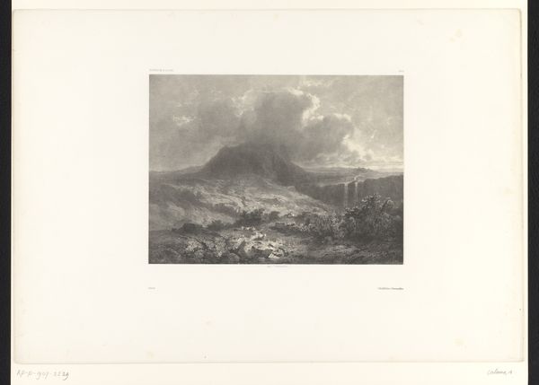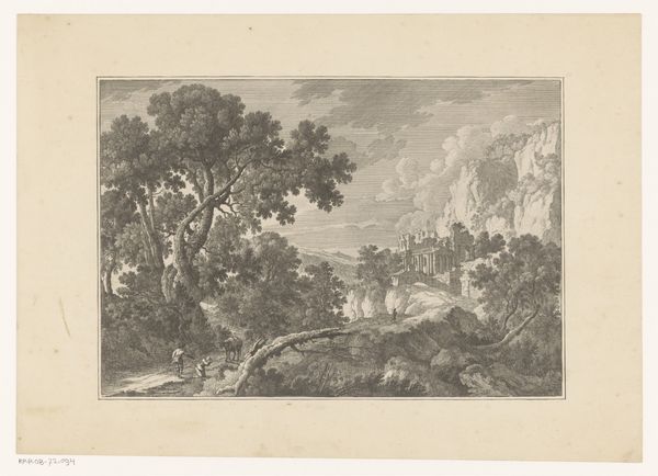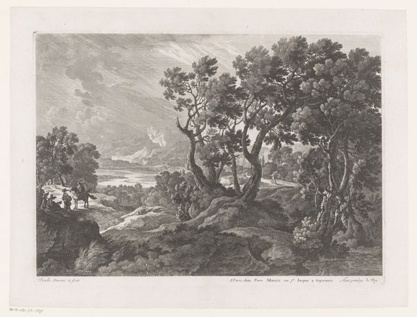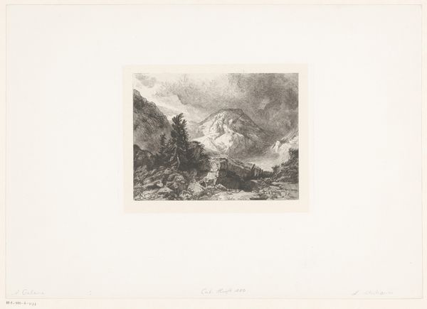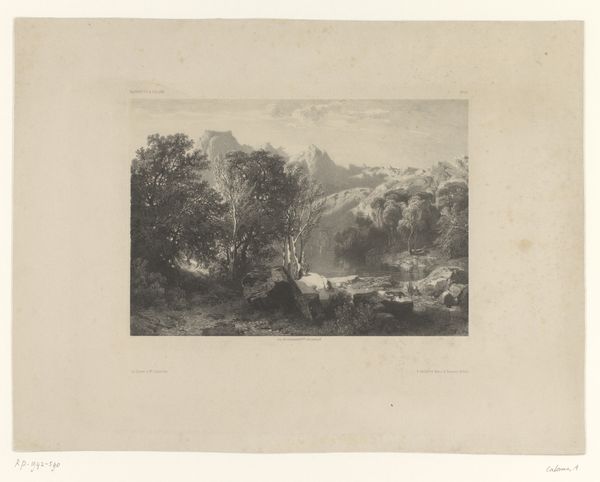 Editor: This is "Mountain Landscape with a Path along a Lake," an etching and engraving by Alexandre Calame, dating from around 1852 to 1855. It feels so still, almost dreamlike... How would you interpret this work? Curator: Well, first off, that stillness speaks volumes, doesn't it? Calame, ever the romantic, seems to be inviting us into a hushed dialogue with nature itself. I imagine him sketching in a waistcoat, wind slightly ruffling his meticulously arranged hair. Note how the path leads your eye deeper, urging you into this vast, almost spiritual space. Do you sense that feeling? Editor: Absolutely! It's like the path is an invitation to leave the everyday world behind. Curator: Exactly! And consider the period—Romanticism! Big feelings, dramatic landscapes! I think Calame captures this desire for escape beautifully. He wasn’t just documenting scenery, he was after the sublime experience – that feeling of awe mixed with a touch of pleasant terror that comes from contemplating the enormity of the natural world. Makes you feel small, but connected, no? Editor: Definitely! I can see that. The size of the landscape really emphasizes that human connection to nature, or lack thereof. I wonder, why etching, do you think, instead of oil? Curator: A splendid question! Etching lends itself beautifully to intricate detail, look closely and you see all the trees. It offers this remarkable opportunity to play with light and shadow, adding a touch of mystery that amplifies the feeling of reverie. An aesthetic that feels a bit melancholic, I must say. Editor: That makes a lot of sense. I really learned something new today. Curator: As did I!