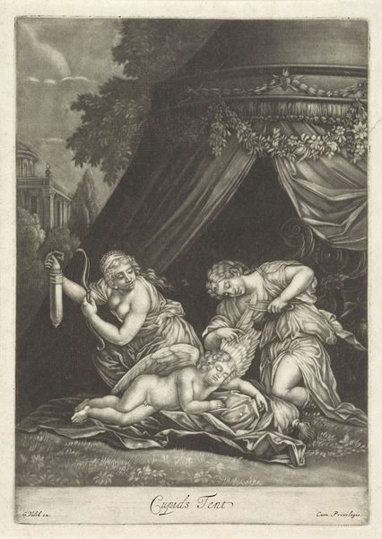 Curator: Look at this fascinating engraving, "Jupiter en Callisto," crafted by Jan Verkolje I between 1660 and 1693. The baroque piece demonstrates history painting and mythological theme in great depth. Editor: It's strikingly intimate. The way the light falls across their faces… there's a charged intensity despite the idyllic landscape backdrop. The monochromatic engraving creates an incredibly moody scene, almost melancholic. Curator: Exactly, the story, of course, is of Jupiter deceiving Callisto. The symbols woven throughout are so indicative of its era. Look at the two cherubs peeking from behind the leaves and trees holding a mask, they show deceit. Callisto’s identity and integrity are under attack. What could this represent materially? Editor: Thinking about materials, the engraver's process itself – the painstaking labor of carving and printing - amplifies the layers of narrative here. The use of engraving is fascinating: It enabled widespread reproduction. The myth of Jupiter, a tale originally told to power, suddenly made consumable through these engravings. What does it mean to mass produce something previously reserved for aristocratic consumption? Curator: Indeed, the medium allowed the mythology and symbolism to permeate society and spread the symbolic weight far and wide. Editor: And the artist's hand is so visible. The pressure and consistency must have been intense during production! It underscores this blend of luxury and accessibility. Curator: I’m intrigued, still, by the enduring presence of the reeds next to Callisto’s feet! Could the use of natural materials signify a material connection between earth and divine story telling? Editor: That is a key detail indeed. Jan Verkolje asks, it seems, for viewers to reconsider how myth and nature intersect in daily life as products! Curator: Well, this really makes you reflect upon the story and process behind creating mythological engraving in this historical time. Editor: Absolutely, looking at "Jupiter en Callisto," we discover the story in art history intersects materially with mass production!