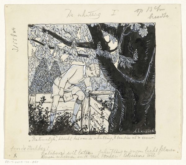 Curator: Here we have a pen and ink drawing titled "Elf Sitting on a Mushroom," dating roughly from 1875 to 1925. The work also appears to have watercolor illustration techniques at play, if you look closer. Editor: The mood strikes me as melancholic, almost absurd. There’s this elaborate fairy figure juxtaposed with these two... weeping shapes? Is it supposed to be comical or sad? Curator: It's intriguing, isn't it? The fairy-painting genre often depicted fantastical beings in idyllic settings. However, this piece possesses a strong Art Nouveau sensibility and the stark black ink creates a distinctly different tone. We see the clear lines, careful design work on the fairy’s wings and attire; these recall printmaking techniques, suggesting it might have been intended for reproduction. Editor: Absolutely. And I am stuck on the technical craft of creating these dense blacks, the ink, how was it mixed and applied to maintain depth, also creating highlights from these fields of dark material. And these teardrops—what's their material presence on the page? They're like a material representation of feelings, made physically present and even a bit clumsy, like the execution. Curator: That could be the intent. Fairies gained immense popularity through children's literature during the late 19th and early 20th centuries, often serving as moral allegories. Perhaps these figures, with their exaggerated sorrow, are meant to underscore a moral lesson. Or a sign of mourning during world war, given its timeframe? Editor: Potentially. If this was part of a publication or was commissioned artwork, thinking about the context and its immediate market for that piece is key to the work. What would consumers, or an audience at the time be thinking? I still read them as funny, though. They really got it coming with the leaky shoes. Curator: Despite our differing viewpoints, this drawing prompts reflection on societal values embedded within art and illustrations, as it engages popular aesthetics during this period. It demonstrates how art history can unveil subtle social critiques even within seemingly whimsical subject matter. Editor: Agreed. Ultimately, the piece’s enduring value comes from this dialogue between its production processes and the questions it presents about the labor of rendering emotional states in tangible materials.