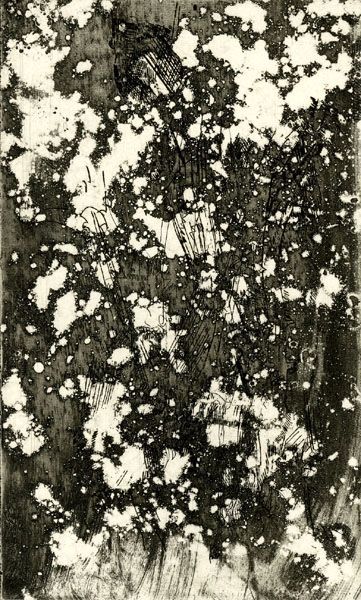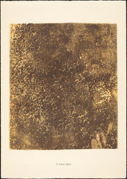 Editor: So, this is Jean Dubuffet’s "Dispositif au sol," created in 1958. It’s a print, a monochromatic sort of piece. There's a raw, almost earthy feel to it. What do you make of it? Curator: Well, immediately, I’m drawn to the materiality of the piece. Look at how Dubuffet utilizes printmaking, traditionally seen as a medium for reproduction, to create something so palpably unique. How do you think the 'earthy feel' you mentioned is achieved through process? Editor: I guess it’s the texture. You can almost feel the grit and roughness of… something. It's not smooth or refined like some prints. Curator: Exactly. Consider this within the context of post-war art. There's a breakdown of traditional artistic boundaries, a move towards raw expression, but the materiality here takes center stage. Dubuffet is forcing us to consider what printmaking can be beyond mere replication. Do you see any implications in terms of labor and production? Editor: Hmmm... maybe the apparent ease of printmaking is subverted? It looks so chaotic, almost violently applied, not easily produced. It doesn't look like mass production, it feels closer to craft. Curator: Precisely! He challenges the hierarchy that placed painting and sculpture above craft. Dubuffet is actively reclaiming value for those 'lesser' forms of artistic labor. The question now is how that material perspective informs what the viewer sees and what value system it reinforces. Editor: That's a totally new perspective for me, thanks! It changes the way I see the artist’s involvement, not just the aesthetic. Curator: And hopefully opens avenues for analyzing other works with an emphasis on their own conditions of production and reception.