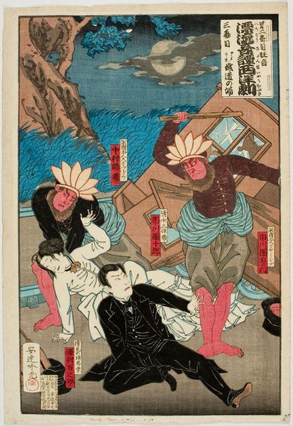 Adachi Ginkō created this woodblock print, “Act II, Scene 2: Along Train Tracks in America,” as part of the series *The Strange Tale of the Castaways: A Western Kabuki*. Made during the Meiji era, this print reflects Japan's complex relationship with the West. It attempts to translate the foreign, particularly American culture, into a digestible Japanese context through the familiar art form of kabuki theater. This print blends cultural understanding with artistic license. The characters, depicted with striking red skin and elaborate headdresses, are set against a backdrop that is supposedly “American,” yet feels distinctly Japanese in its aesthetic. The scene is violent, a theatrical clash of cultures. The presence of the train tracks and the title suggest a narrative rooted in the modernization and westernization of Japan. Yet, the exaggerated expressions and stylized figures invite us to consider how identity is performed and perceived across cultural divides. How does Ginkō want us to feel when viewing this scene? The emotional tension in this print serves as a cultural commentary, highlighting the anxieties and fascinations that came with Japan's encounter with the West.