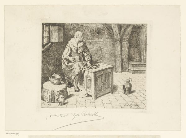 Editor: This is "Werkplaats van Josué Dupon," created sometime between 1874 and 1909, using etching and ink. The etching depicts a studio space; it’s really busy with sculptures, tools, and drawings. It seems quite intimate and detailed, making you wonder about the artist’s process. What do you see in this depiction of a workspace? Curator: What strikes me is how this print invites us to consider the artist's means of production. Dupon has not only created an image, but also left a visual record of the very labor that underpins his art. Consider the prevalence of sculptures in various states. Editor: You're right! The studio feels like a factory. Is this focus on production common for academic art of this period? Curator: It certainly speaks to the changing role of the artist. Etching, as a repeatable medium, opens avenues for wider distribution and consumption of images. It transforms art from a unique object into a reproducible commodity. Editor: I guess I hadn't considered the implications of printing itself as part of the "materials." The print feels much more like a democratic medium. Curator: Precisely. Furthermore, let us reflect upon the arrangement of the scene. How is Dupon subtly showcasing his wares and, in effect, his labor? Where does artistic 'work' start and the 'art' begin? Is he drawing our eye toward the material processes that go into creation? Editor: I'm really learning to see the art, but also the artistic manufacturing behind it. It changes my whole appreciation! Curator: Exactly! Viewing art through a material lens reveals not just the object itself, but also the intricate network of labor, production, and consumption in which it is embedded.