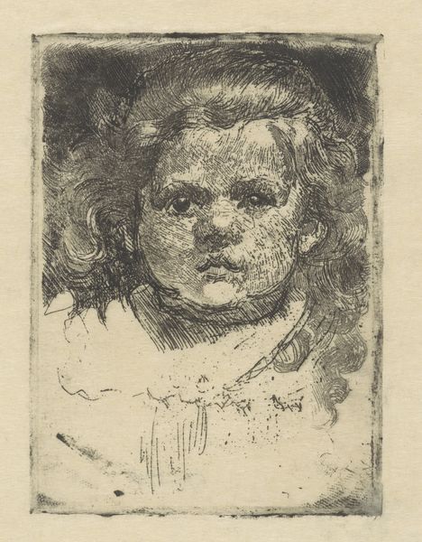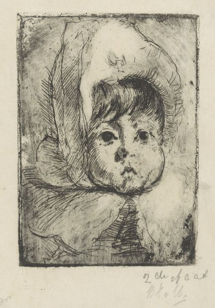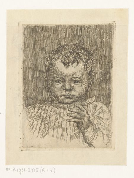 Editor: This is a small etching, "Portret van M.A. van Houten als kind met krullend haar"—Portrait of M.A. van Houten as a child with curly hair—it's dated sometime between 1877 and 1950. I’m really drawn to the delicate lines. There's almost a melancholic quality about the child’s expression. What stands out to you when you look at it? Curator: Oh, this little cherub! You're right, there is a stillness, isn't there? It reminds me of old family photos, where the subjects are so formally posed, almost like little adults. The artist has captured a fleeting moment, imbuing the child with a pensiveness that transcends the simple portrait. Do you get a sense of a specific era from the clothing or the hairstyle? It certainly whispers of a bygone age, doesn’t it? I wonder what M.A. van Houten went on to do... Editor: I do think the frilly collar and curls really set the scene, yes. There is a preciousness about how they depicted children. And to your question, what happened to van Houten, would this be genre painting too, something like a frozen instant from ordinary life? Curator: That’s it exactly! It’s as much a study of childhood as it is a record of an individual. Etching lends itself so well to this kind of intimate portrayal. The artist really focused on the face, which emerges softly from the shadows, no? It creates such a strong sense of light and depth with what, really, are some very simple means. And there's a tenderness there, too... do you see that in the treatment of the eyes, the soft shading? Almost like a mother’s gaze captured on paper, do you agree? Editor: Yes, I see that. It is interesting to consider the connection between artist and subject, even though it is so long ago. Curator: Absolutely. Art brings us closer to these forgotten stories, allowing us to look at people’s face with empathy, even from a different era. This little one makes us imagine the possibilities ahead!