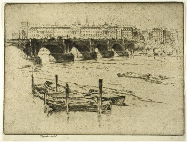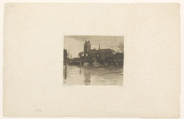 Curator: Let's discuss Charles Adams Platt's etching, "Bridge at Saragossa," dating from the 19th century. What strikes you first? Editor: There's a subdued stillness about this scene, a sepia-toned nostalgia. The reflection of the bridge arches in the water adds a touch of dreamy continuity to this urban tableau. Curator: Platt's work reveals a real fascination with structure, both architectural and social. Consider the bridge itself – a feat of engineering and commerce, facilitating the flow of people and goods across the river Ebro. Editor: Absolutely. The bridge is the central motif, almost an emblem of transition and connection, visually dividing the earthly from the divine, reflected in the towering cathedral dominating the city skyline behind. Note the dome, repeated arches in the bridge – it suggests wholeness and cosmic harmony, linking heaven and earth. Curator: Precisely. The technique, etching, itself lends to that symbolic interplay, using acid to corrode lines into a metal plate that then prints an image in reverse. The image isn't just observed; it’s created through industrial chemical activity that mirrors, physically, the symbolic reversals occurring on the surface. Editor: Interesting. The use of etching adds a layer of cultural weight, given the associations with printmaking as a method to widely disseminate ideas. How do you see that function for this work? Is it romanticizing industry? Curator: No, I think Platt uses it to subtly examine progress in a historical moment, but to sentimentalize the process overlooks its place within industry at this time. In a period where bridges and infrastructural construction was remaking European spaces. It is a study of change but also one very literally of manufacture. Editor: The cathedral becomes a counterweight to that narrative then; this architectural and spiritual continuity contrasting against the ephemerality of industrial advance represented in that material process and built object you mention. The dark and light are nearly reversed in the reflection too! It's potent. Curator: Exactly. I leave contemplating both what is seen and what this delicate little material object represents about its own making. Editor: Indeed. It makes you wonder if such structures will exist for future generations to behold or reflect upon in art of their own!