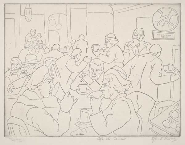 Curator: Let's delve into Ivan Gomenkov's woodcut print, "At the Peak Hour," created sometime between 1955 and 1957. Editor: Whew, I feel claustrophobic just looking at it! That packed train carriage... it's a visceral depiction of urban commuting. The harsh black and white amplifies the feeling of being crammed in. Curator: Indeed. The print uses a rather realist style to depict a very familiar Soviet theme: the masses utilizing public transport in a large city. Notice how Gomenkov's sharp lines give each face a unique, almost caricatured, quality. It speaks volumes about post-war urban life in the Soviet Union, as commutes grew more intense. Editor: There’s almost a grimness to it, despite the everyday scene. It feels raw, unromanticized. It's missing that socialist heroic painting optimism you might expect, you know? The woodcut lends itself perfectly to this, making it immediate and forceful. Curator: Precisely! This departure from overtly positive portrayals reflects a broader undercurrent in Soviet art where subtle social commentary became permissible, yet often veiled within genre scenes. The title, "At the Peak Hour," ironically understates the turmoil and tension depicted. Editor: It reminds me of grainy old films depicting ordinary lives during extraordinary times, the close quarters breathing life into everyone and crushing them. Also, look at the way Gomenkov used contrast—deep shadows and stark highlights give it real emotional depth. A visual poem for crowded spaces. Curator: Gomenkov expertly captured not just the physical reality of that packed commute, but also the emotional experience tied to it, the resilience, even stoicism of the passengers navigating their daily grind. It acts as both social documentation and psychological observation, typical within many Russian avant-garde pieces from the period. Editor: Absolutely, this piece has such depth that every little space speaks out its own meaning. Makes me rethink my aversion to taking the subway on rush hour; I'd almost welcome the chance now...almost! Curator: Gomenkov prompts us to see the artistic merit of life's ordinary moments and maybe look deeper the next time we commute ourselves. Editor: What I see now is how extraordinary ordinary life is, made immortal here on black and white. That´s pure gold.