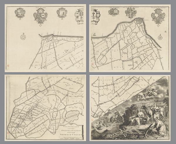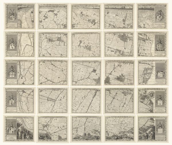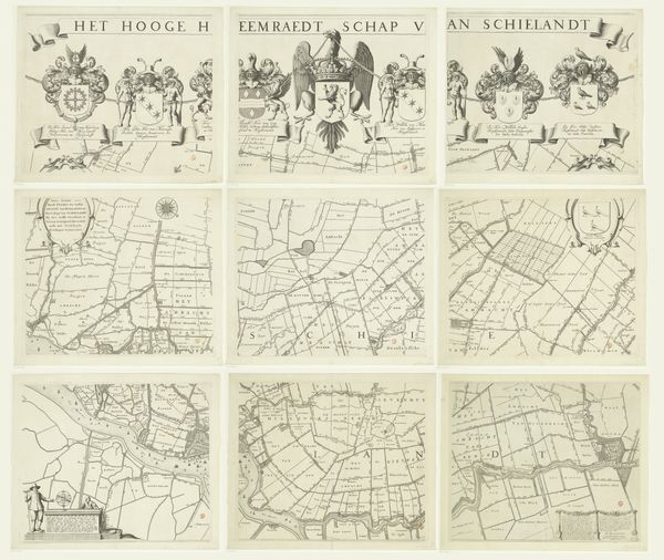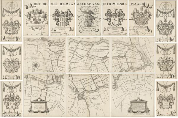 Editor: Here we have "Kaart van Kennemerland en West-Friesland, bestaande uit zestien delen," or a map of Kennemerland and West Friesland in sixteen parts, created around 1680 by Coenraet Decker. It’s a detailed engraving. The composition, being sixteen separate maps, makes me think of a mosaic of Dutch land. How would you interpret this work? Curator: Considering this piece through a historical lens, what stands out is the intersection of art, cartography, and civic identity in the Dutch Golden Age. These maps were more than geographical tools; they served a public role. Think of the immense effort to control water, and these maps becoming symbols of regional power, intended for public display, even serving as declarations of the Dutch Republic’s accomplishments in land reclamation and governance. Do you notice the elaborate heraldry at the top of some of the panels? Editor: I do! It’s interesting to consider the political message intertwined within the geographical data. I initially focused on it being a visually interesting object. Were maps typically viewed as propaganda at the time? Curator: "Propaganda" might be too strong a term. These maps bolstered regional pride and Dutch ingenuity. Also, consider the economic implications; detailed maps aided trade and navigation. These beautifully rendered maps reflect the economic prosperity and evolving national identity of the Dutch Republic. These images became tools for reinforcing and shaping a specific vision of the world. Editor: I never thought about maps as more than just navigation tools; it's interesting how they were charged with this visual and social message. Thank you for shifting my perspective. Curator: It’s through these layers of social, political, and historical context that we start to see art as active, always shaping and being shaped by society.