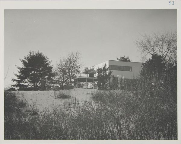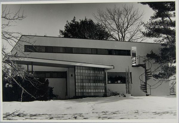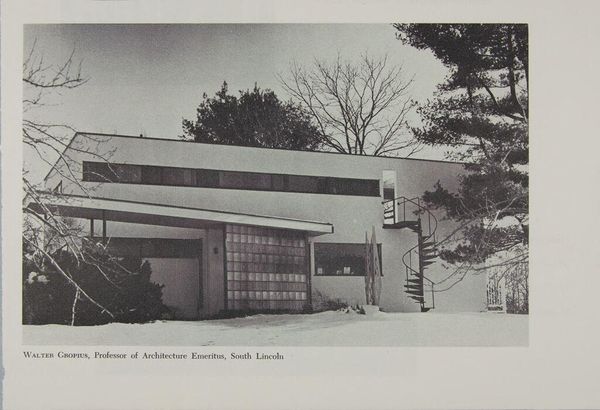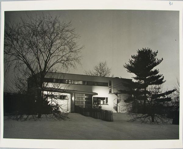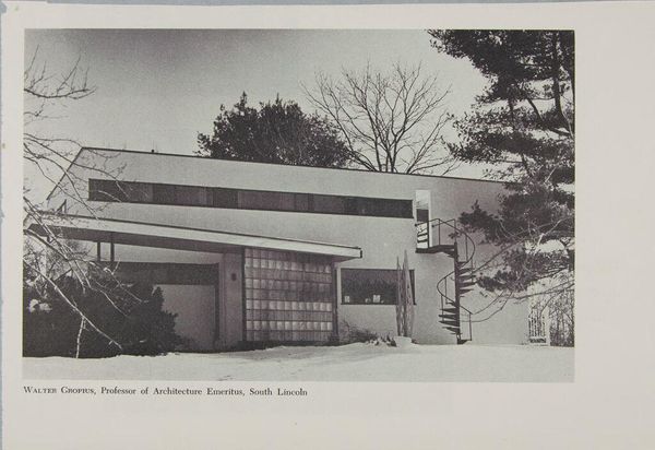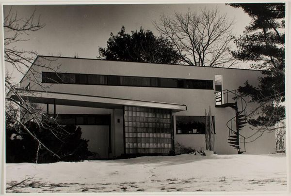 Curator: Let's discuss Paul Davis's photographic study, "Gropius Residence, Lincoln, Massachusetts, 1938," now part of the Harvard Art Museums collection. Editor: The photograph has a stark, almost severe quality. The grid-like facade and the spiral staircase create a fascinating tension. Curator: Indeed. This image resonates with the Bauhaus ethos, emphasizing functionality and rational design. Gropius, in his architecture, aimed to create spaces that fostered community and challenged traditional hierarchies. Editor: It's intriguing to consider the materials – the concrete, glass, steel – and how their industrial nature reflects a shift toward mass production and accessibility in housing. Curator: Exactly. The photograph, through its stark depiction, invites us to consider how architectural forms intersect with social and political ideals, reflecting a utopian vision rooted in social reform. Editor: Thinking about the labor involved in constructing this residence, the choices inherent in these materials. Very evocative. Curator: It’s a powerful visual record that sparks important dialogue about architecture's role within broader historical narratives. Editor: It certainly offers a compelling look at the materials and production that shaped modern living.