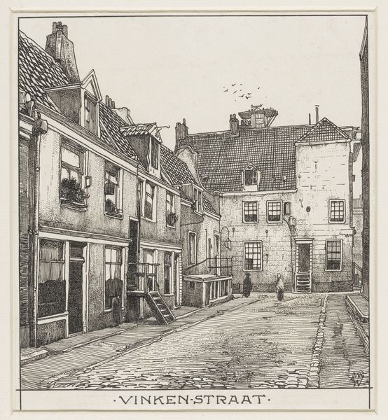 This detailed drawing captures a neighborhood scene in Amsterdam's Willemstraat, created by Willem Wenckebach. The eye is immediately drawn to the architectural forms; the gabled houses dominate the composition with their stepped facades. Wenckebach employs a meticulous technique, using dense lines to define the structure and texture of the buildings. The monochromatic palette enhances the focus on form and spatial relationships. Notice how the artist uses line weight to suggest depth, with darker, bolder lines in the foreground and lighter lines for elements further away. This careful rendering evokes a sense of intimacy and immediacy, as if we are standing on the street ourselves. The regularity and detail in Wenckebach's linework offer a structured view of urban life, while the individual character of each building suggests the unique stories held within. This piece not only captures a specific location but also provides a broader commentary on urban space. As such, the drawing invites us to consider how such architectural and pictorial structures help us create an understanding of place and identity.