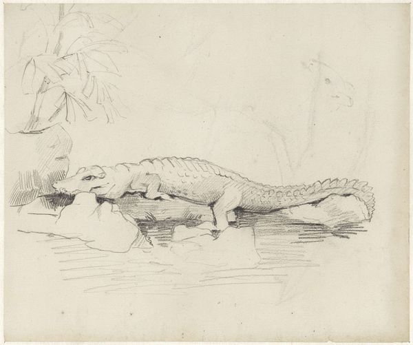 Curator: "Varanus albigularis," the Rock Monitor, drawn by Robert Jacob Gordon possibly in 1779. What do you make of this depiction? Editor: Well, first, the materiality strikes me. It’s watercolor and pencil on paper. The animal seems meticulously rendered, but the landscape is… less so. It’s fascinating how the artist uses the materials to emphasize different elements. What stands out to you? Curator: The means of production! The artist, the paper, the pencils and watercolors themselves—they all represent specific resources deployed for a particular purpose. This wasn't "art" in the fine art sense we might consider today. Look at the ruler included. This was scientific documentation, perhaps for colonial administration or resource extraction. What labor went into sourcing these materials, into their production, into their transport? And what was the purpose of this representation for its commissioner? Editor: So, you see it less as an artistic expression and more as a form of…resource management, almost? Curator: Precisely. And consider how the consumption of materials like paper, pigments, and even the animal's habitat itself might be connected. Were these materials readily available to Gordon or were they trade goods acquired through complex supply chains? The colored pencils, for example: from where did they originate? What dyes were used? These things tell us something significant about production networks and colonial science in the 18th century. Editor: That perspective really shifts how I see it. I was initially drawn to the almost quaint aesthetic, but now I see the work embedded within these networks of resource use and scientific labor. Curator: It encourages us to reconsider what constitutes "art" and how social and material circumstances define it. I also see that "art" of its time became the extraction of wealth during colonisation. Editor: I definitely learned to look past the surface and to think about the making of art and objects as the beginning of its full story, rather than the end! Thanks.