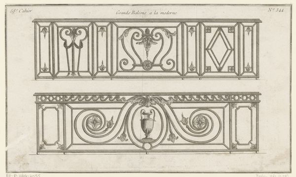 This is "Bedroom with a Canopy Bed" by Pierre Gabriel Berthault, made in the 18th century. Berthault meticulously renders an interior using precise lines and geometric forms, creating a composition that balances symmetry with intricate detail. The bed, centrally positioned, is framed by symmetrical wall panels. The linear perspective emphasizes the depth of the room, inviting the viewer into this private space. The cool monochrome palette accentuates the textures and patterns, from the ornate canopy to the subtle wall stripes, each element contributing to the overall sense of refined elegance. Berthault's architectural drawing is more than a representation; it's a carefully constructed system of signs. The bed, elevated under its canopy, becomes a focal point, a symbol of status and privacy. The surrounding architectural elements, with their classical motifs, reinforce a sense of order and control. The work challenges us to see beyond the surface, to decode the social and cultural values embedded within its formal structure.