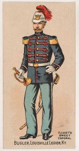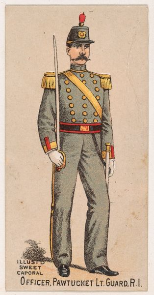 Editor: Here we have "Officer, Howitzer Company, 4th Infantry, New Jersey" from 1888, printed by Kinney Tobacco Company. It's a rather formal portrait, made as a promotional card. I find it interesting how something so related to the tobacco industry has ended up in an art museum. What stands out to you in this print? Curator: The commodification of the officer, and by extension, the military, is central. We must consider this print not primarily as art, but as a consumer object. Think about the labour involved in creating it: the paper manufacture, the printing process itself, the distribution networks linked to the Sweet Caporal cigarettes. What does it tell us about the means of production and how tobacco companies use art? Editor: So you’re saying the image itself isn’t the most important aspect? Curator: Precisely. It's about tracing the network of materials and labour that converged to create this small, seemingly insignificant card. This portrait becomes a vehicle for understanding broader systems of capitalist production and consumption during that era, also demonstrating how a military figure’s image was exploited to generate profit for Kinney Tobacco Company. Editor: That shifts my perspective a lot. So it’s more about understanding its creation in relation to things like mass production and marketing. Curator: Exactly! How did such an image end up in a cigarette packet and then in the Met? Where do the seemingly separate worlds of industry, art, and military converge, and what do those conjunctions reveal about our past? The materials of everyday life provide valuable insight if interrogated thoughtfully. Editor: It definitely gives me a lot to think about, seeing it less as a standalone piece of art and more as part of a bigger historical web of industry and promotion.