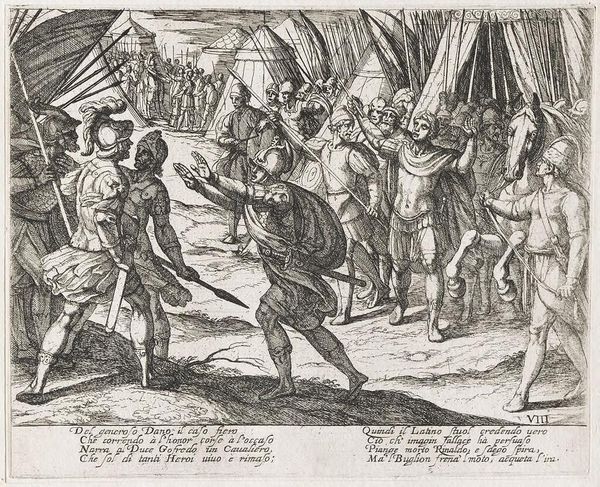 This print by Nicolaas Hogenberg depicts standard-bearers and scholars. The dominant symbols here are the flags, which are called 'Vexilla' in Latin, emblems of authority and allegiance, a tradition rooted in ancient Roman military standards. Consider the persistence of such symbols. Flags, banners, they transcend mere cloth and wood. They evoke a sense of unity and purpose, reappearing throughout history from medieval guilds to modern nation-states. In the Renaissance, the revival of classical antiquity saw these symbols imbued with renewed power. The Vexillum, originally a Roman military standard, was itself a symbol of power, adapted and transformed across time. Its reappearance here speaks to a deep, collective memory of authority and order, a subconscious desire for structure and belonging. These symbols stir powerful emotions, engaging viewers with a primal connection to communal identity and historical continuity. Ultimately, the flags' presence highlights the cyclical nature of symbols, their capacity to resurface, evolve, and take on new meanings.