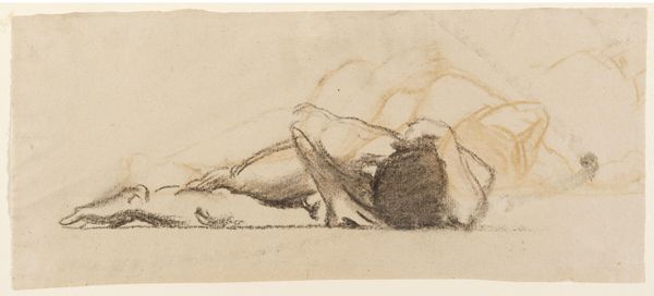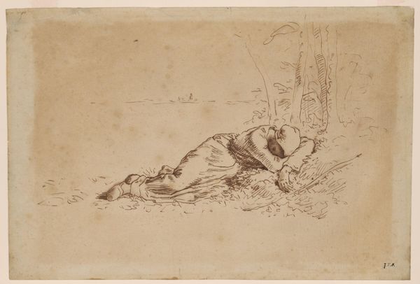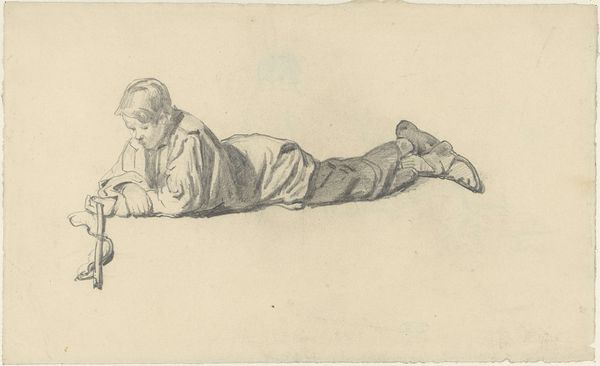 Curator: This lovely sketch is called "Boy Lying in the Grass with a Stick and Jug," made between 1834 and 1903, by Johan Hendrik Weissenbruch. It’s rendered in pencil on paper. Editor: The first thing that strikes me is how peaceful it is. Just a boy, a stick, and a jug… taking a break. The simple lines add to the quiet mood. Curator: Weissenbruch was a master of capturing light and atmosphere, even in a seemingly simple genre scene like this. It's interesting to consider how the Dutch landscape tradition informs even this intimate, almost casual portrait. Editor: It also reminds me of a classical pastoral scene. This child, reclining in the field, is almost a shepherd from ancient mythology, the stick transformed into a symbol of rustic care, even authority. Curator: Precisely. Weissenbruch takes a very realist approach to genre-painting, focusing on everyday subjects, but it is important to consider what the stick and jug might represent. Could the stick, so closely held, symbolize support or guidance? Is the jug simply for carrying water or is there perhaps a more symbolic association with simple provision? Editor: Maybe both? In Dutch society at that time, simplicity was still a valued virtue in contrast to urban excess, which aligns with Realist art's broader societal function of showing truth and connecting with the audience on a common level. Even today, there’s a certain romance we attach to this kind of rural tranquility. Curator: It’s compelling how a seemingly ordinary scene can open up layers of meaning and historical context, wouldn't you agree? Editor: Definitely, it reveals that every artwork is connected to society and history in some ways. This artwork helps one see how even a casual sketch like this shows deeper cultural values.