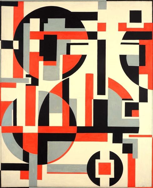 Curator: Erich Buchholz’s "Untitled," created around 1920, is a compelling example of early 20th-century abstract painting, closely associated with De Stijl and Constructivism. Editor: The striking contrast of the red and black geometric shapes really grabs you, doesn't it? There is something inherently architectural in its composition. The work seems to hum with a raw, almost industrial energy, though made of paint, its as sharp as iron. Curator: Absolutely. It's important to view this work through the lens of its time. Post-World War I Europe was grappling with reconstruction, both physically and socially. The bold, uncompromising geometry of artists like Buchholz resonated with the desire for a new, rational order. These simplified shapes, these strong lines – they reject ornamentation for functionality, and thus reflect a revolutionary sensibility towards structure and order. Editor: I wonder, thinking about the process of its creation, what sort of materials would Buchholz have employed, working as he was in the Weimar Republic with attendant limitations on material supply. Was it a readily available oil-based enamel, swiftly applied in broad brushstrokes or with tools such as scrapers or even rollers? Because how its actually built deeply affects its social power. Curator: The context of the Weimar Republic, indeed, brings forward a key point about the production conditions affecting not only material choice but artistic intentions themselves. De Stijl and Constructivism often embraced industrial materials and techniques as a means to democratize art – to make it accessible and relevant to everyday life. By choosing abstraction, Buchholz and his peers sought to create a universal visual language free from nationalistic or class-based associations. Editor: That’s compelling. Viewing the social function of “art for the people”, one has to acknowledge a bit of tension implicit within these avowals. After all, even supposedly universal visual languages require cultural coding to be 'read'. Can abstract painting of this type successfully claim universality? Curator: Precisely, this gets right to the complicated core of artistic intention. Was the project fully attainable, viewed practically? In interrogating the relationship between artistic output and social consumption, we reveal that "art for the people" is indeed caught within inherent tension between intention, labor, access, and understanding. Editor: Looking at the work once more, the colors pop a bit more, the organization takes shape more vividly now. It's like a diagram for something never constructed. Curator: And I am again impressed at how works like these attempted to negotiate a role for art in a changing world.