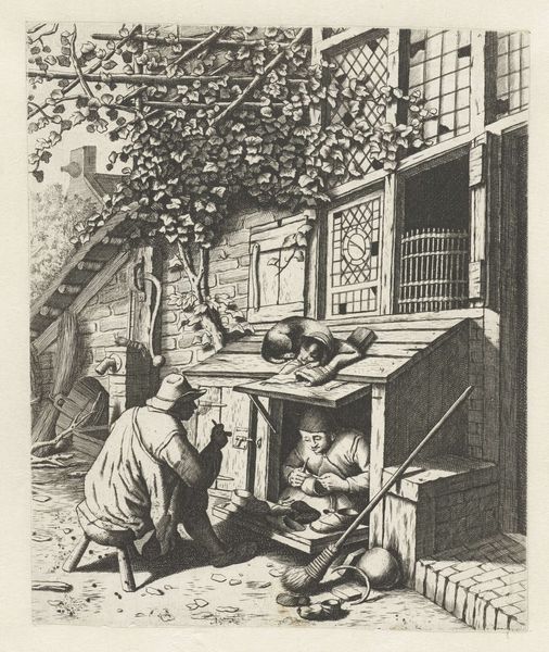 Adriaen van Ostade made this etching of a shoemaker in his workshop in the Dutch Republic sometime in the 17th century. The image presents a glimpse into the domestic life and trades of the working class. We see the shoemaker and his apprentice at labor, while a dog sleeps peacefully on the workshop roof. The setting is humble, but it's also orderly, perhaps reflecting the virtues of hard work and simple living that were so important in the Dutch Golden Age. Van Ostade's choice of subject matter and his detailed rendering of everyday life also reflect the growing importance of the merchant class, who sought images that represented their own values and experiences. Prints like these were circulated among a wide public. By studying such images, and the social history of the print market, we can better understand the values and aspirations of ordinary people in the Dutch Republic.