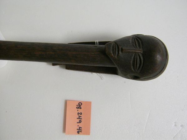 This wooden spoon was carved by a Tlingit artist. Tlingit art is integral to their culture. It reflects their relationship to the natural world and their deep connection to the spiritual realm. The spoon transcends its function as a mere eating utensil, embodying profound symbolic meaning. The intricate carving of a human-like figure may represent an ancestor, a clan emblem, or a mythical being central to Tlingit cosmology. Figures are often rendered to emphasize the power and prestige associated with the feast-giver. The spoon becomes a vehicle through which social hierarchies are reinforced and cultural narratives are transmitted. The choice of material carries its own weight; the grain of the wood is a reminder of the earth. The spoon invites us to consider the complex ways in which identity, history, and tradition are interwoven within the cultural landscape of the Tlingit people.